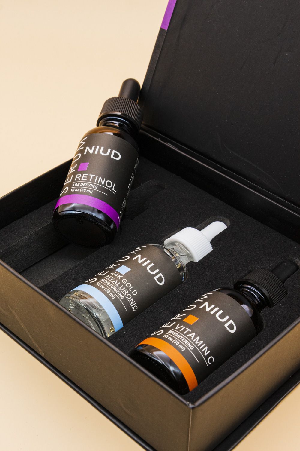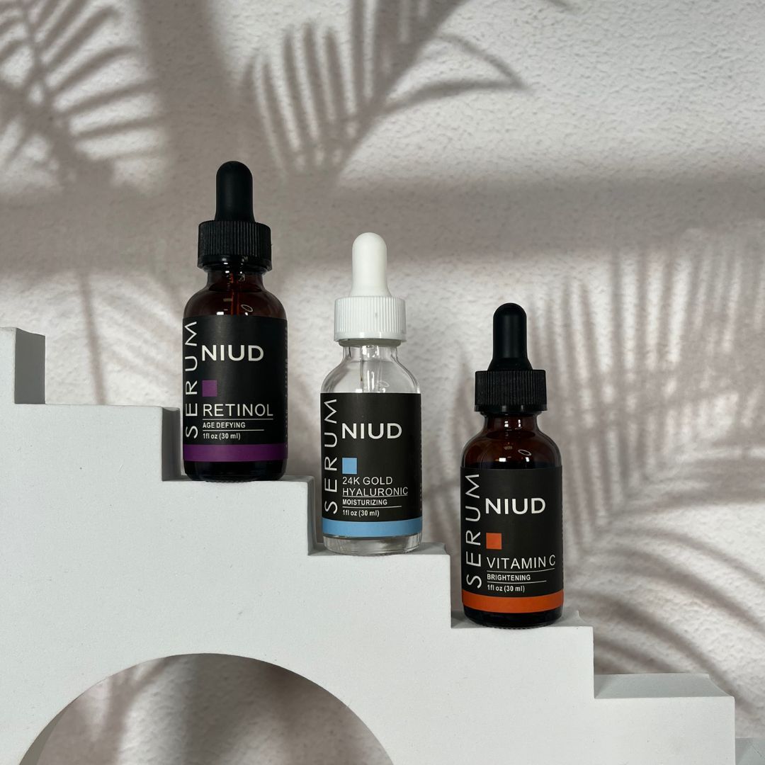 Descubre el Kit 3 Serums Niud, la combinación perfecta para una piel radiante, hidratada y rejuvenecida. Este pack incluye Retinol, Vitamina C y Ácido Hialurónico, tres activos esenciales que trabajan en sinergia para mejorar la textura, luminosidad e hidratación de la piel.